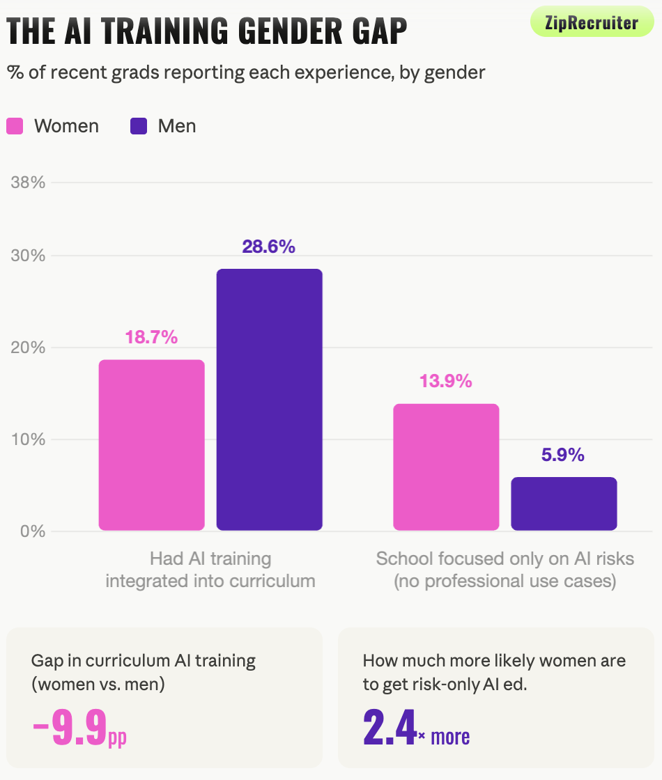 😮 Female grads are more than TWICE as likely as men to say the only AI education they got was focused on risks - not how to actually use AI to in their careers...